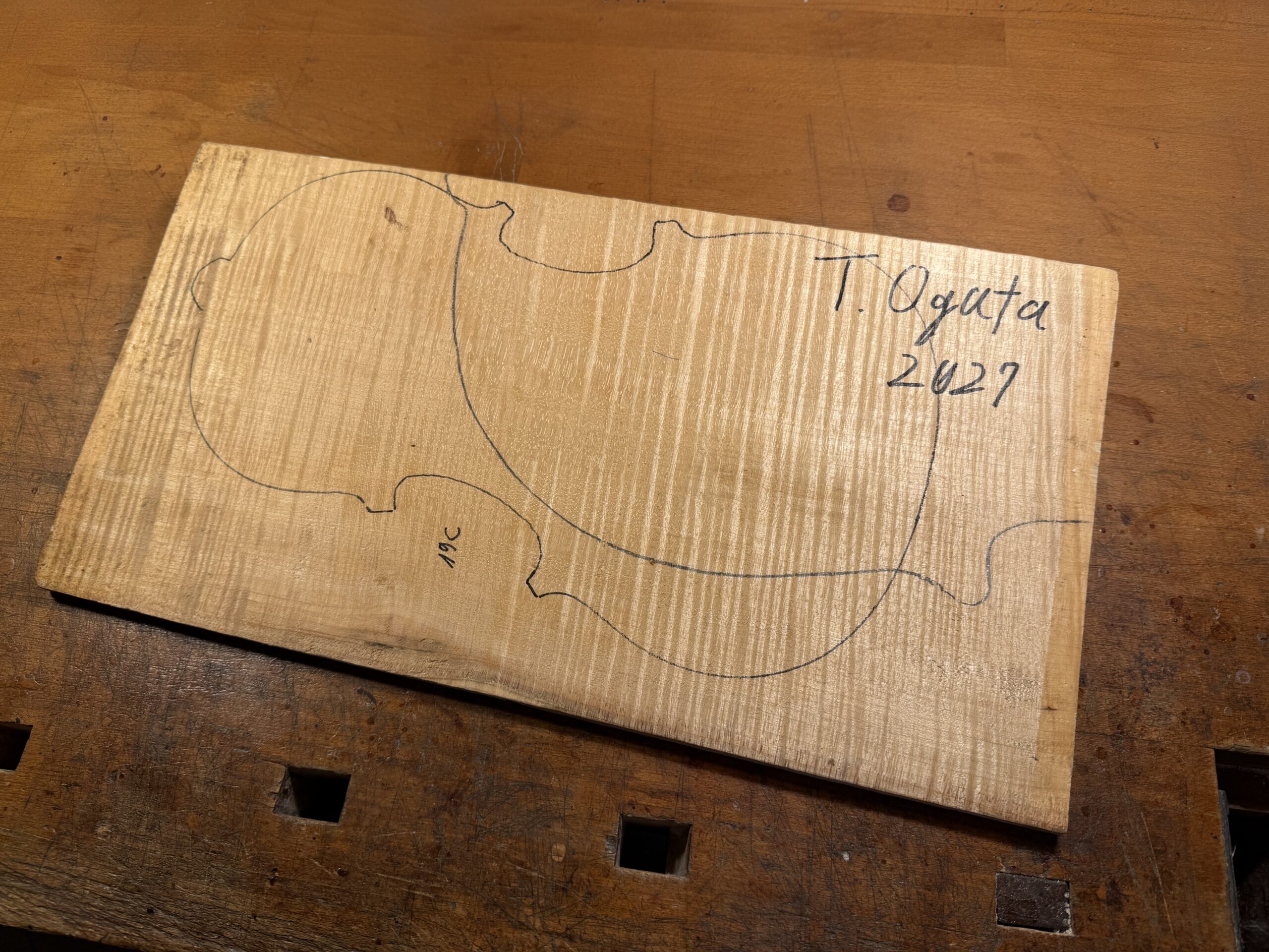 早速次回作のヴァイオリン裏板の選定をして頂きました。裏板は楓(カエデ)の木で作られます。虎杢の模様は様々で、お客様には好きな材料を選んでいただく事にしています。選定された木材には伝統的にお名前を書いて頂くことになっておりまして、今回も書いて頂きました。