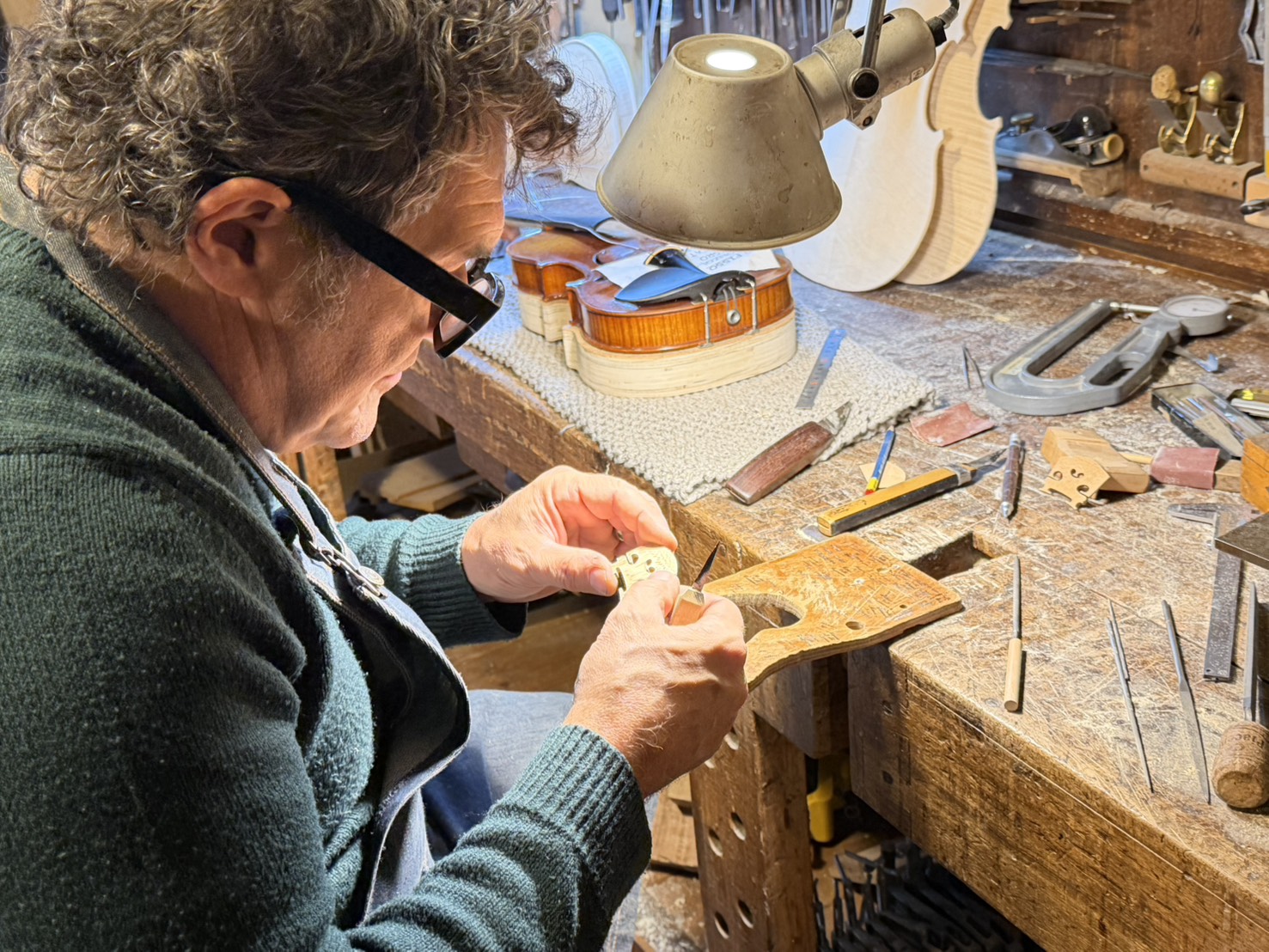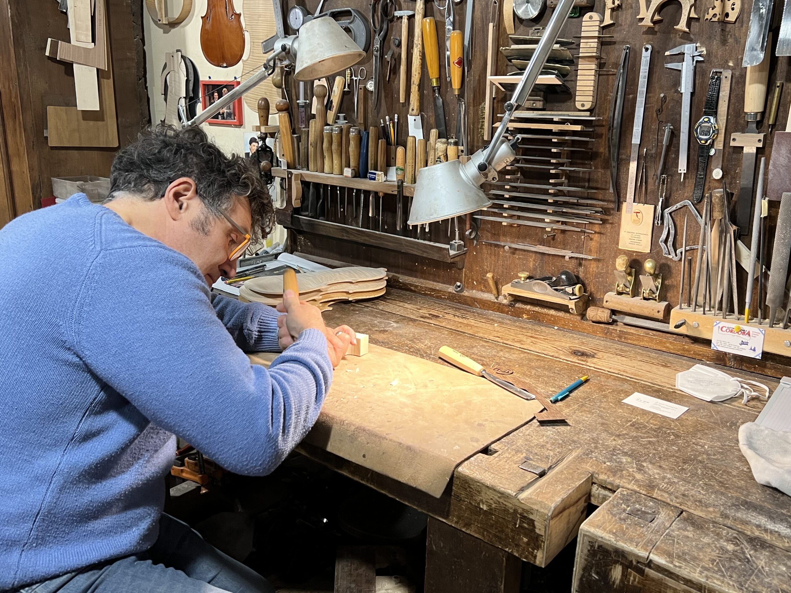 その光景からは、Marco Nolli氏が低音楽器の世界で積み重ねてこられた経験の深さが、工房の空気そのものを通して伝わってきます。