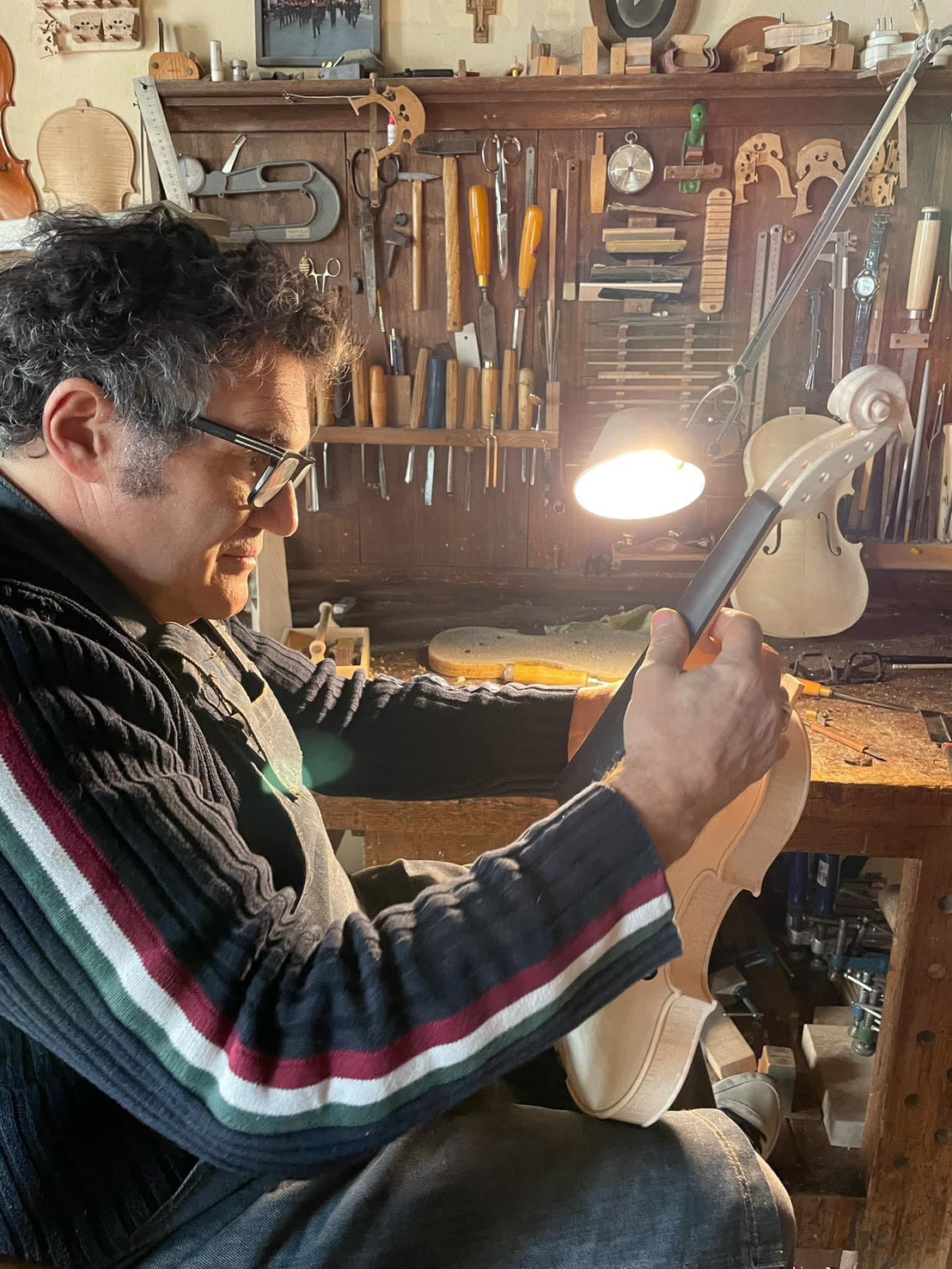 Marco Nolli氏は、イタリア・クレモナに工房を構え、ヴァイオリンからコントラバスに至るまで幅広く手がける製作家です。
